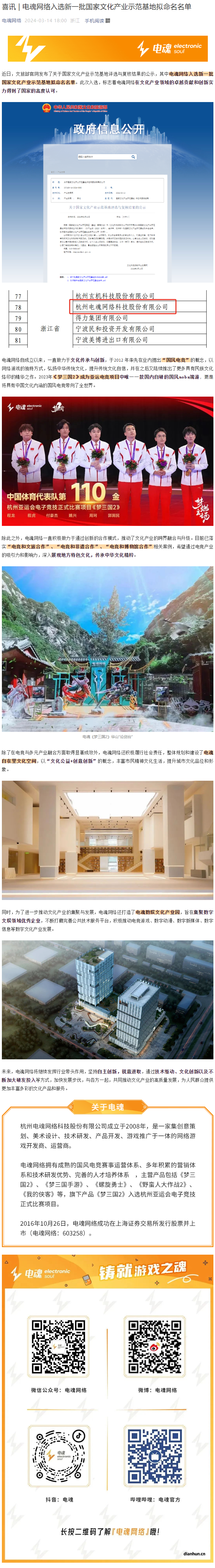 喜訊 | 電魂網(wǎng)絡(luò)入選新一批國家文化產(chǎn)業(yè)示范基地擬命名名單